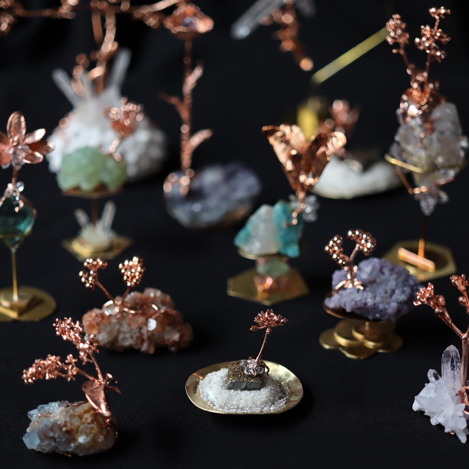地球が過ごしてきた永いながい年月を結晶化した鉱物と、儚い一瞬の姿を金属化し時を止めた植物。自然が生み出す造形の美しさと時間を閉じ込めました。