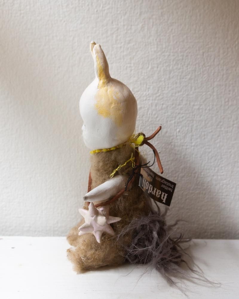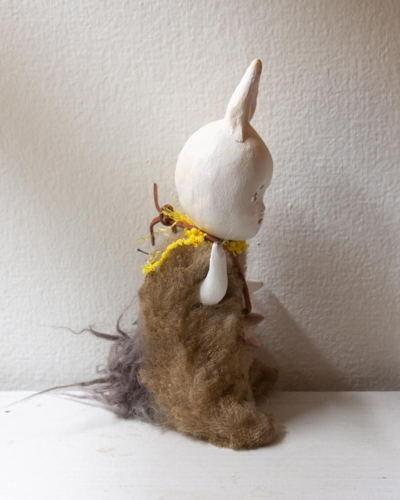 石塑粘土、胡粉、アクリル絵の具、ファー(アクリル)、ヒノキおがくず