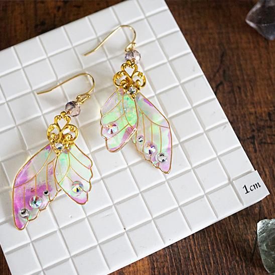 ワイヤーとオーロラフィルムを使用した蝶の羽の耳飾りです。
