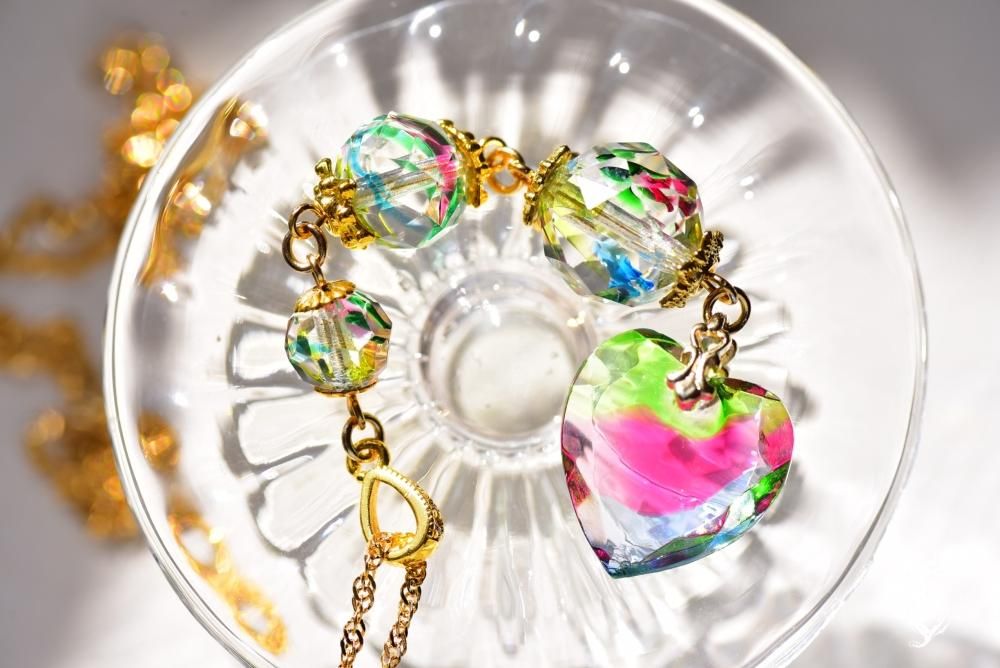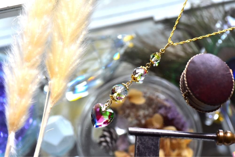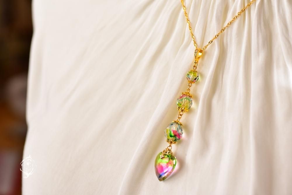 虹色に輝くハート型のアイリスガラスとビーズが連なったネックレス。