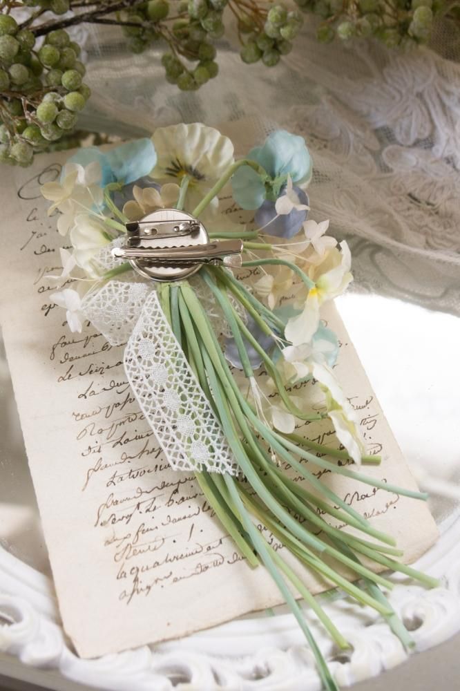 お花畑から摘み取ってレースでまとめたようなコサージュ。