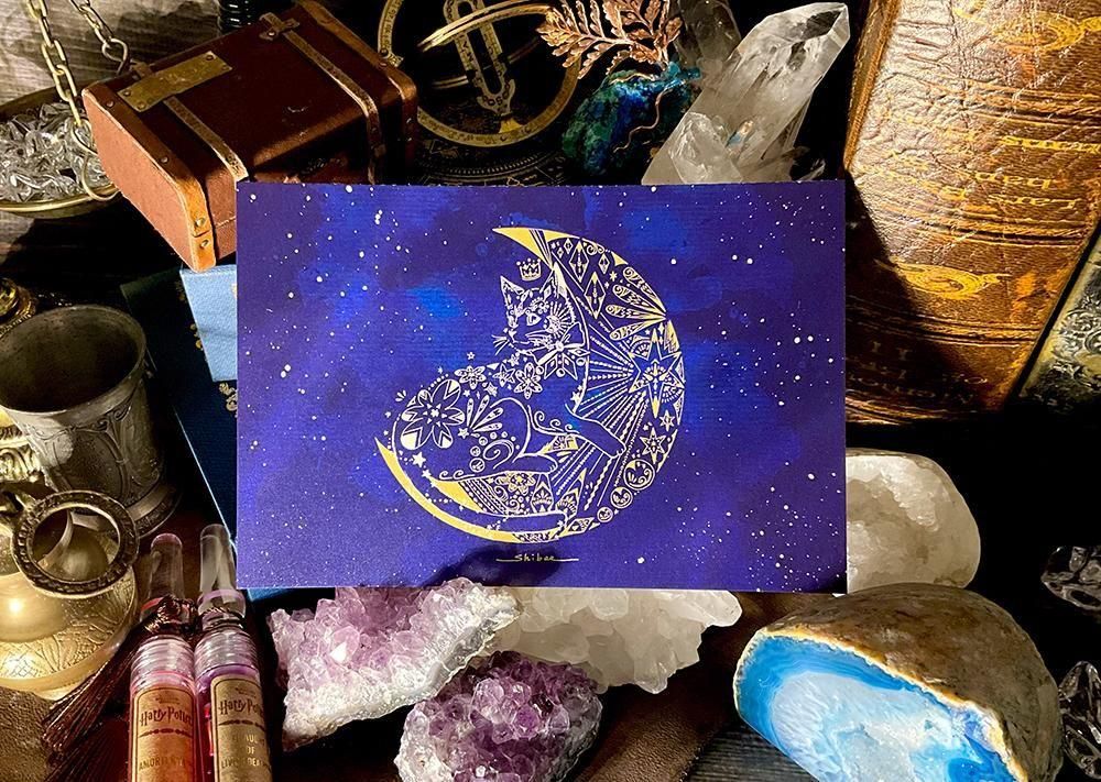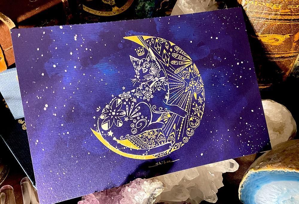 月のゆりかごに揺られながら、流れ星の競争を眺めている猫のアスティリア。