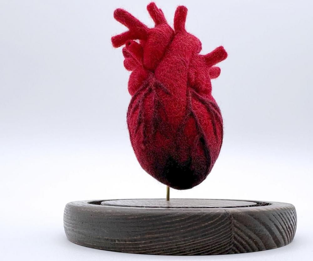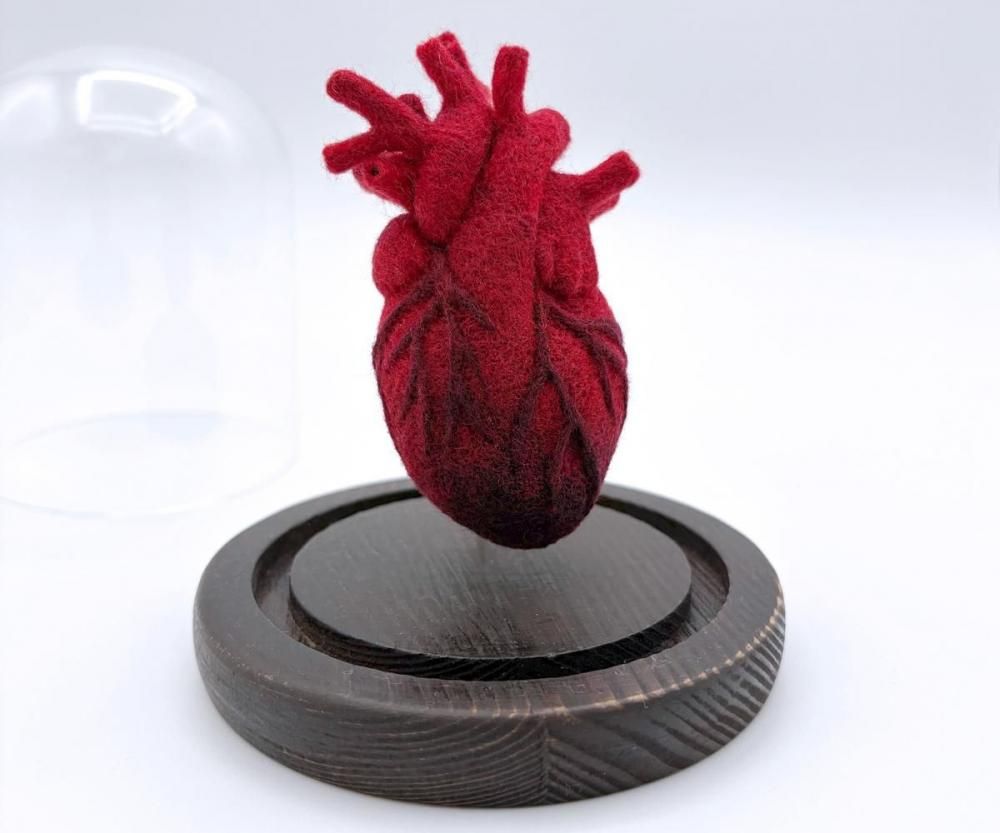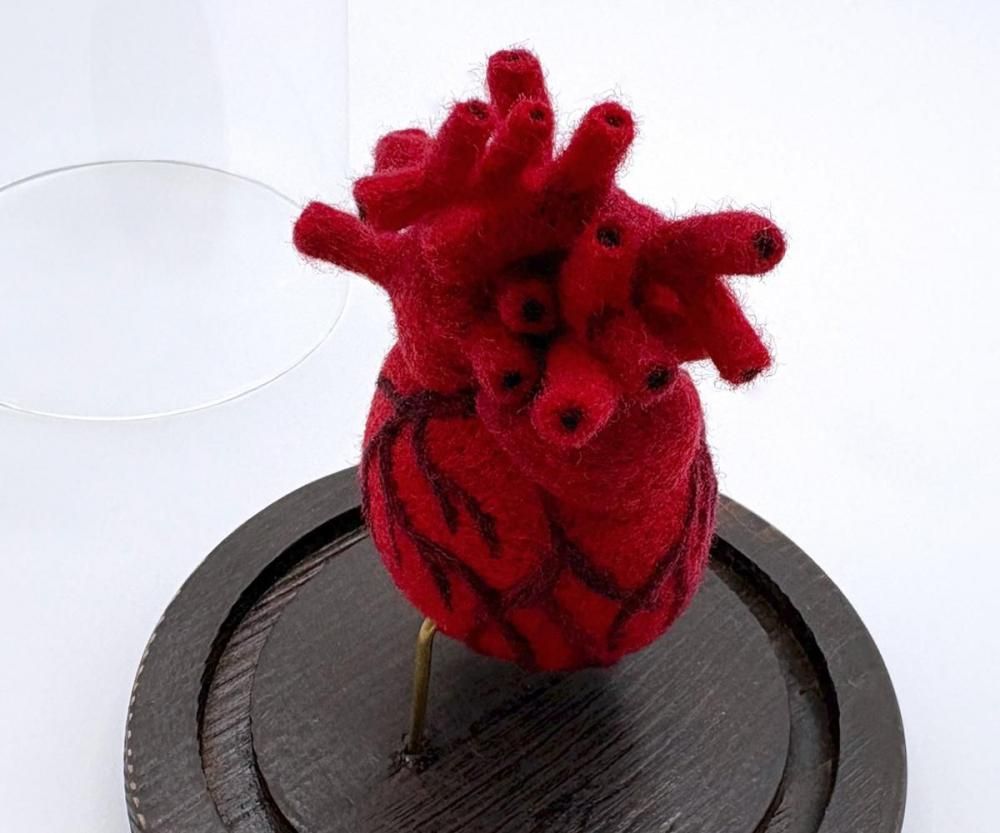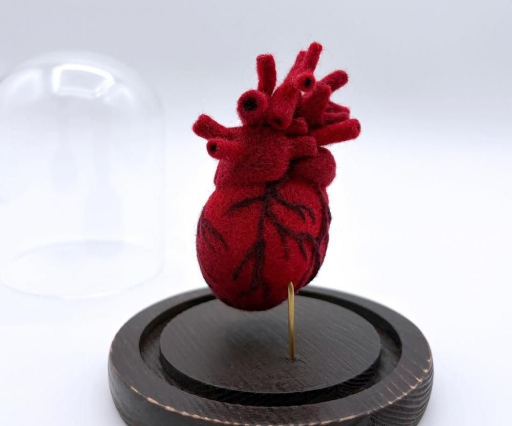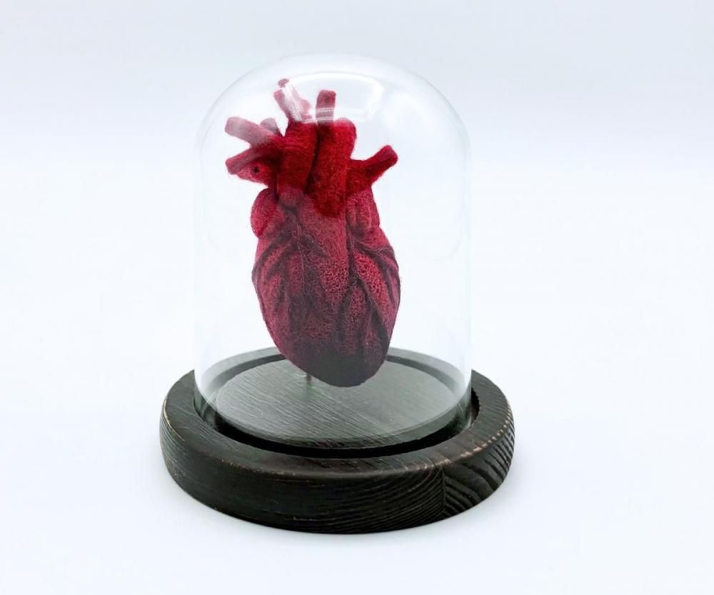 フェルトで作った心臓の立体をガラスドーム仕立てにしました。