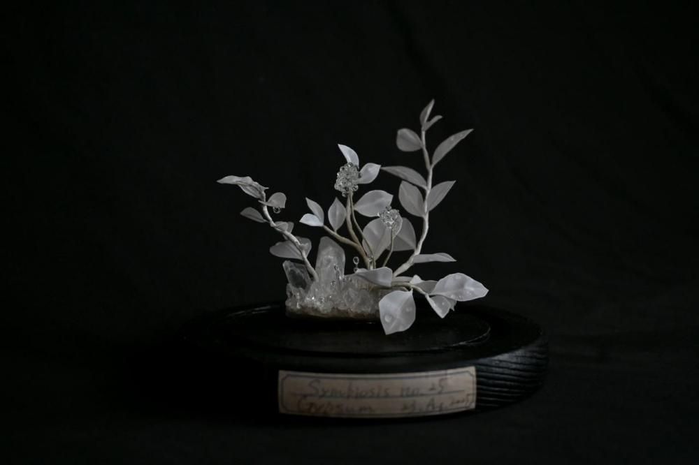 優しい煌めきのセレナイト(石膏)に植物や粘菌が共生しています。