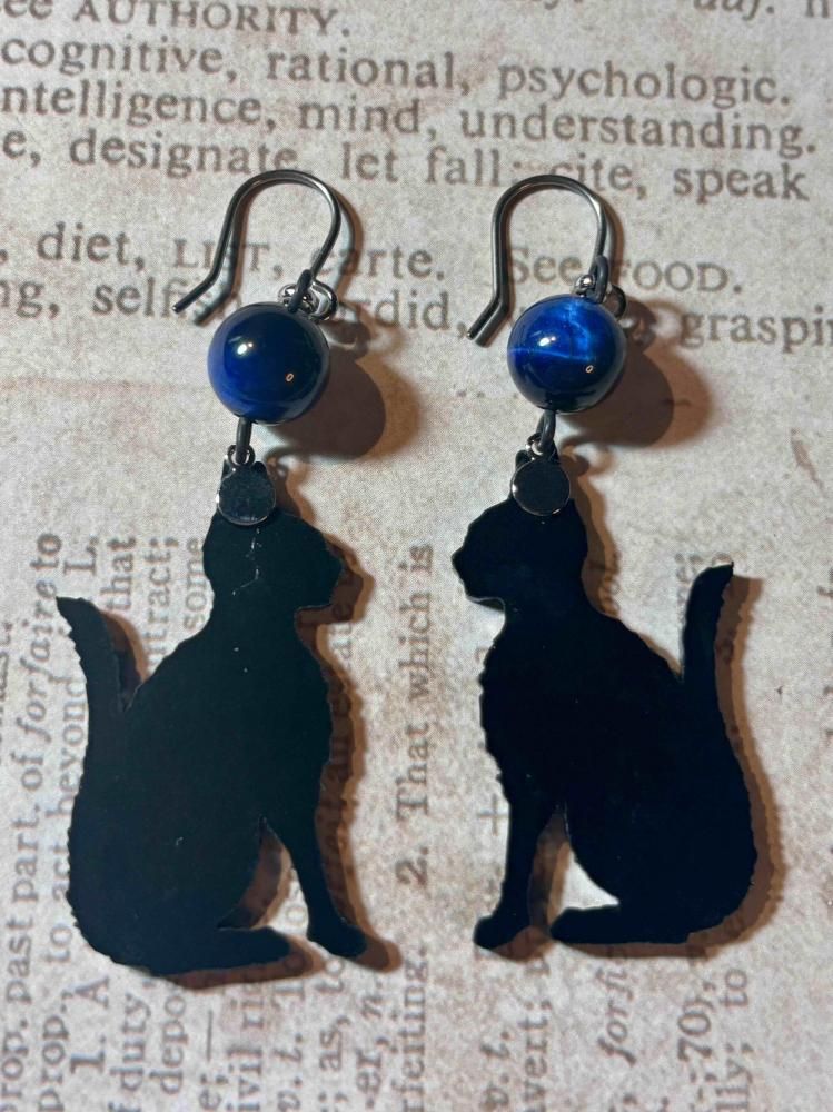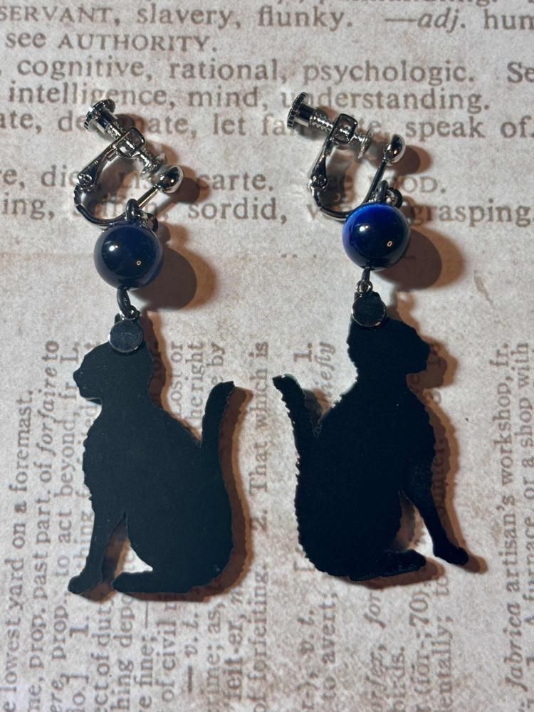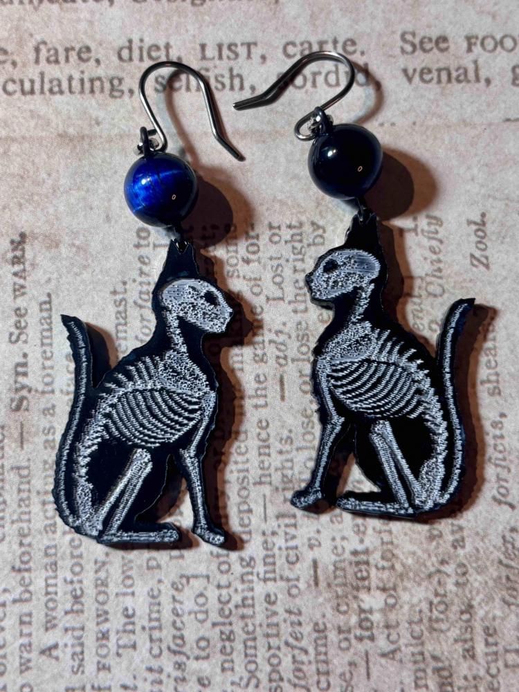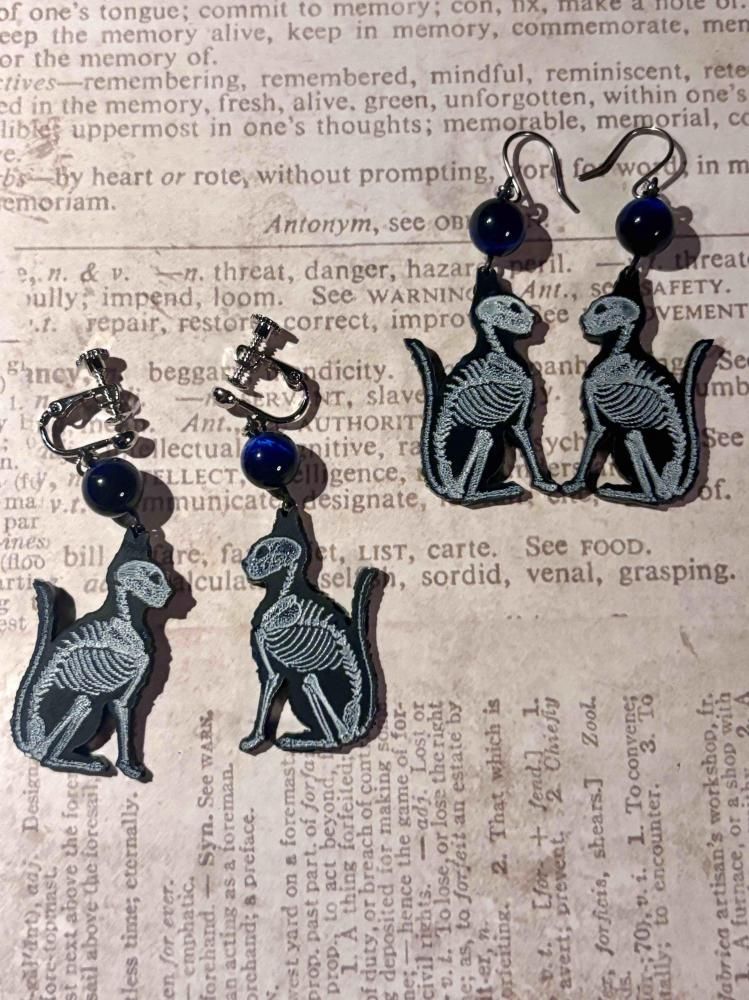 猫のシルエットに骨格のイラストが彫刻されたレントゲンのような見た目のイヤーアクセです。
