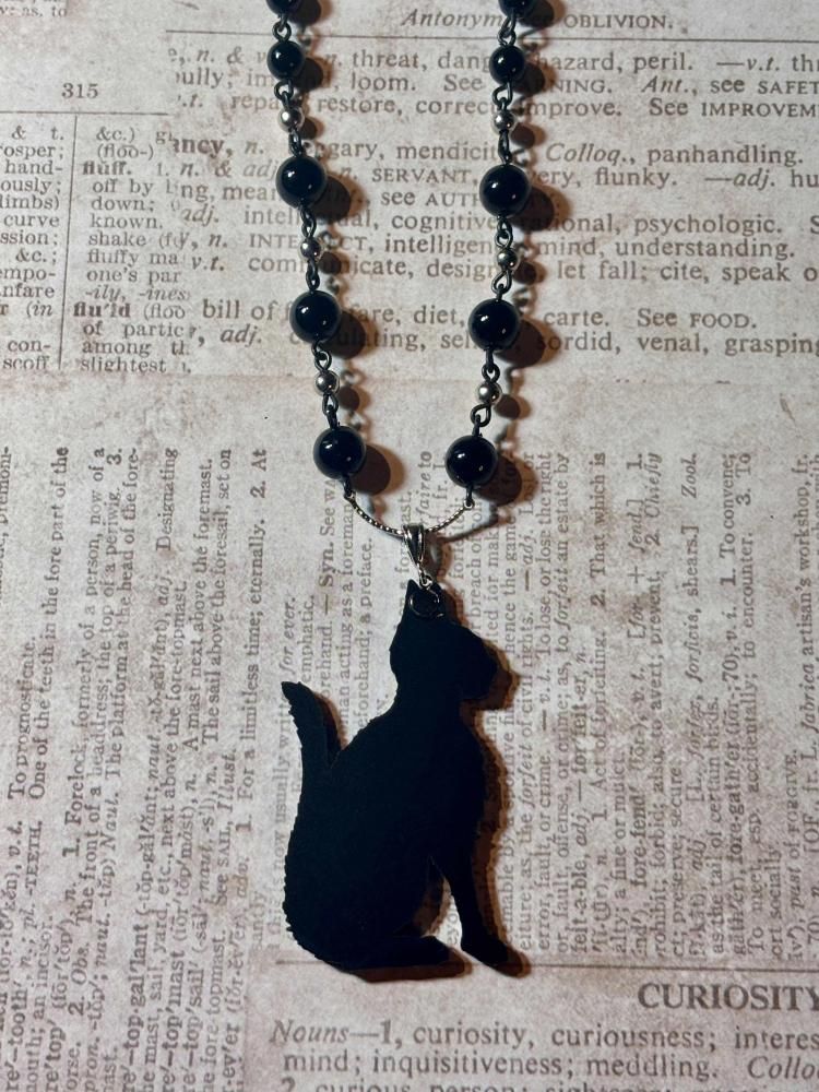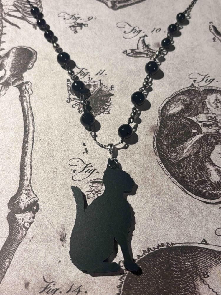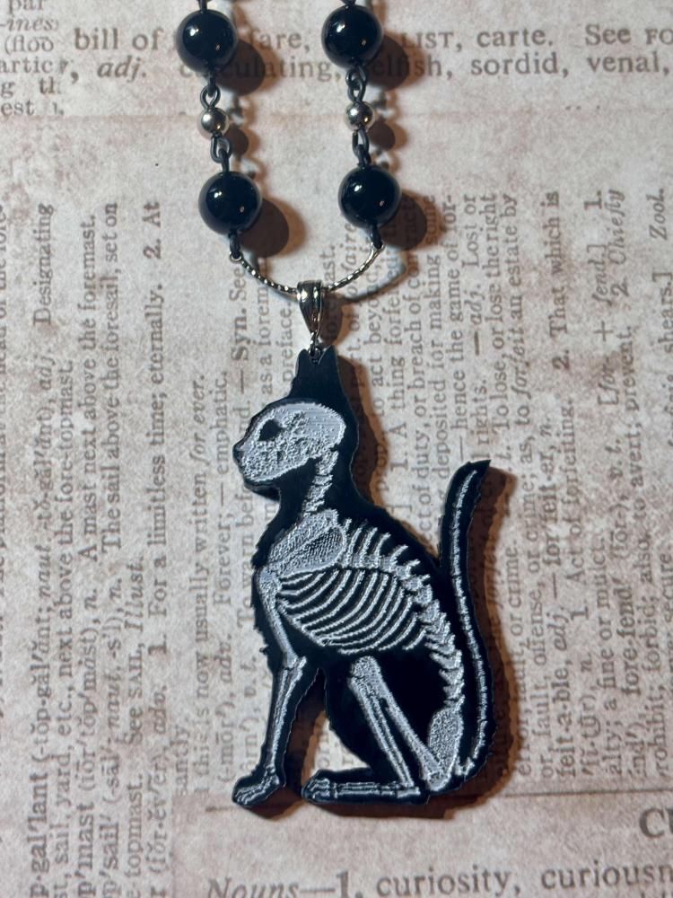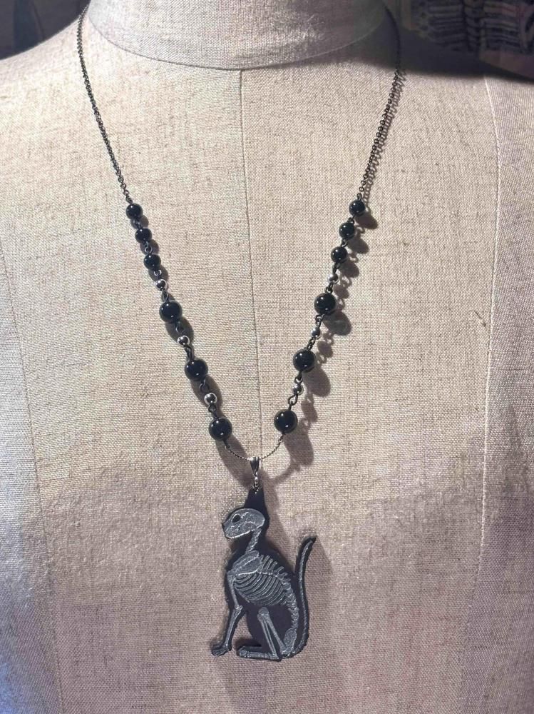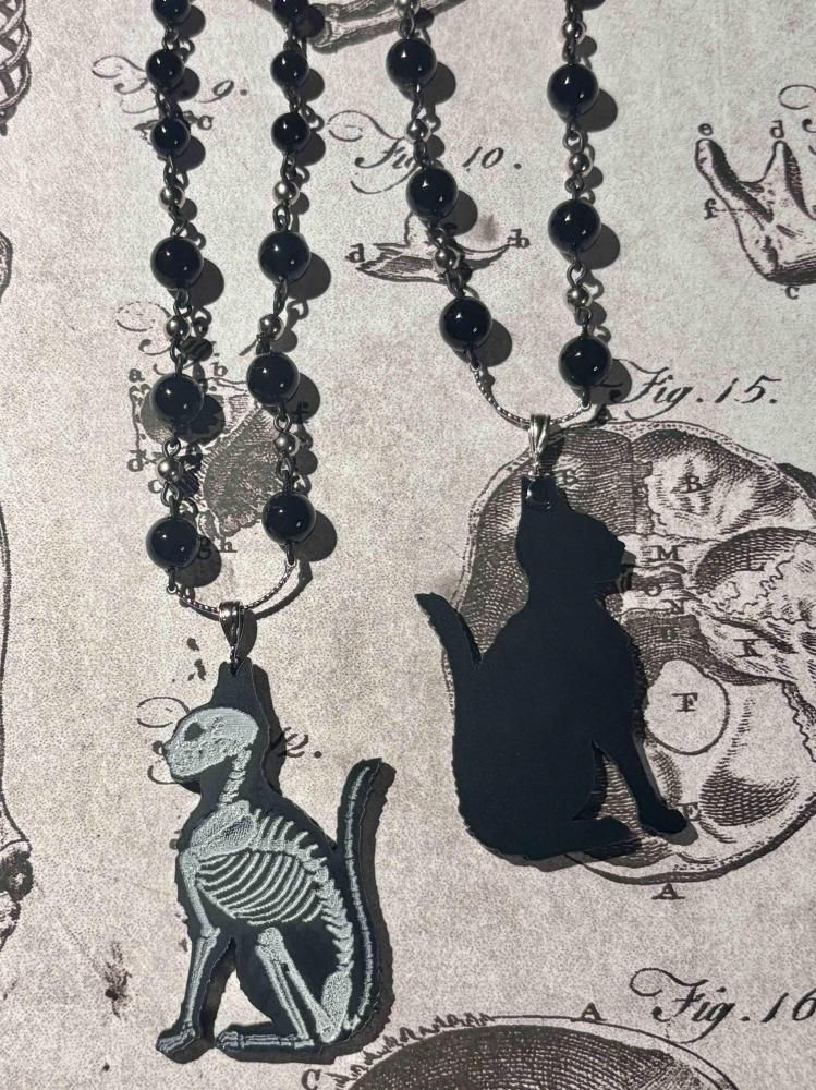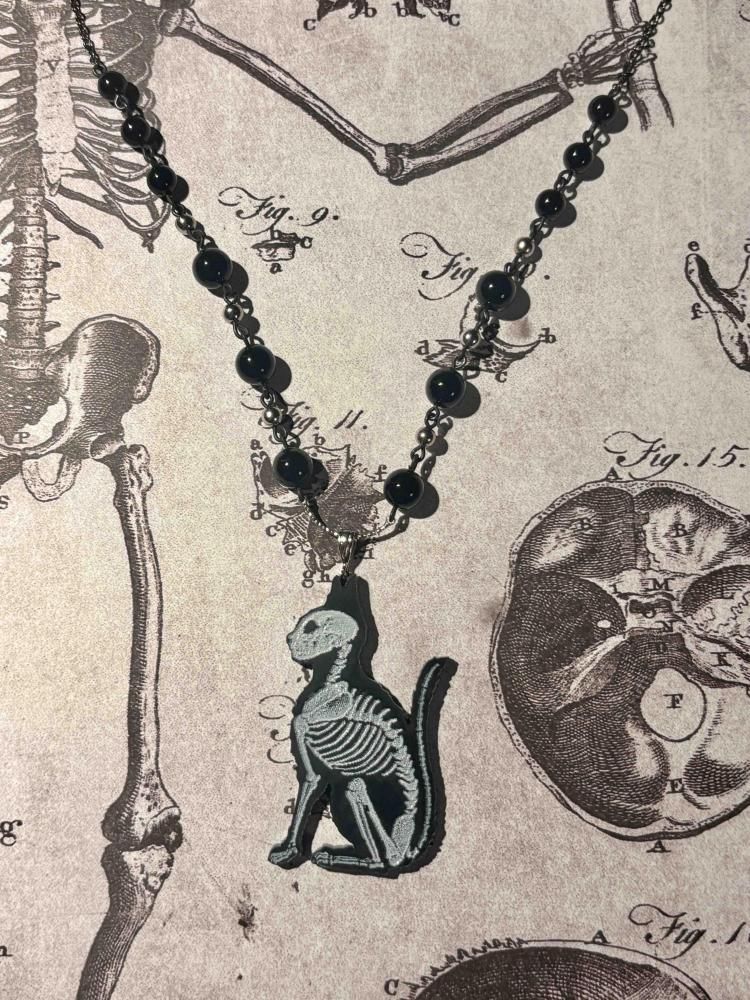 猫のシルエットに骨格のイラストが彫刻されたレントゲンのような見た目のネックレスです。