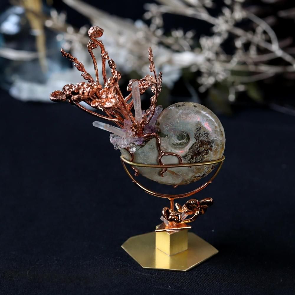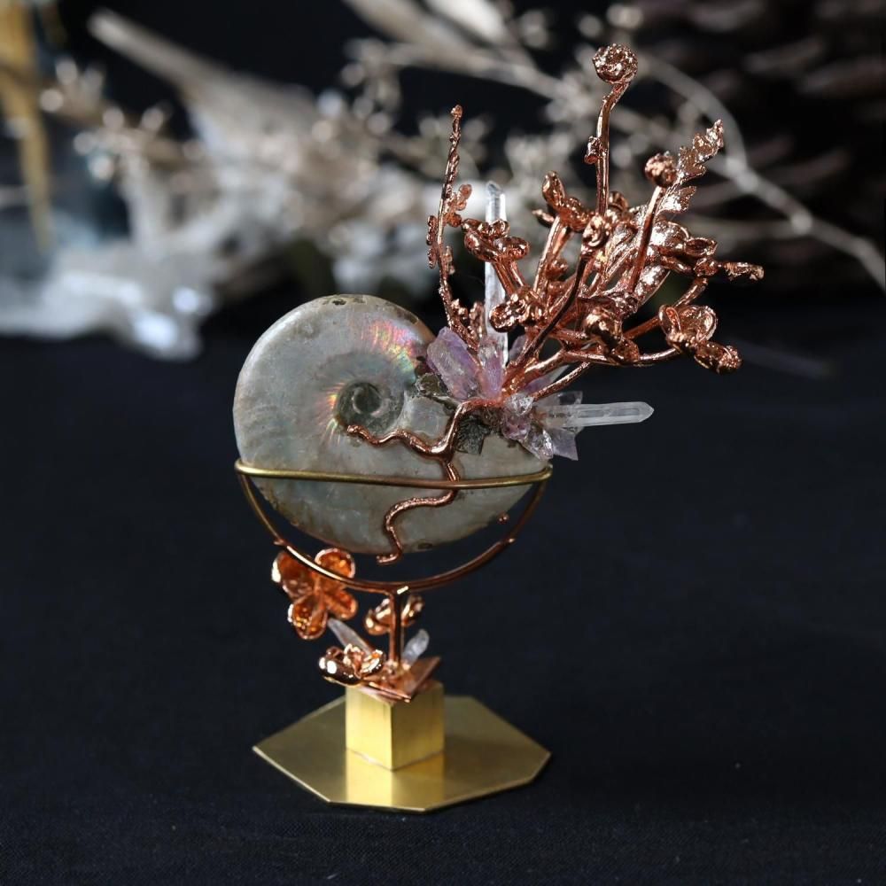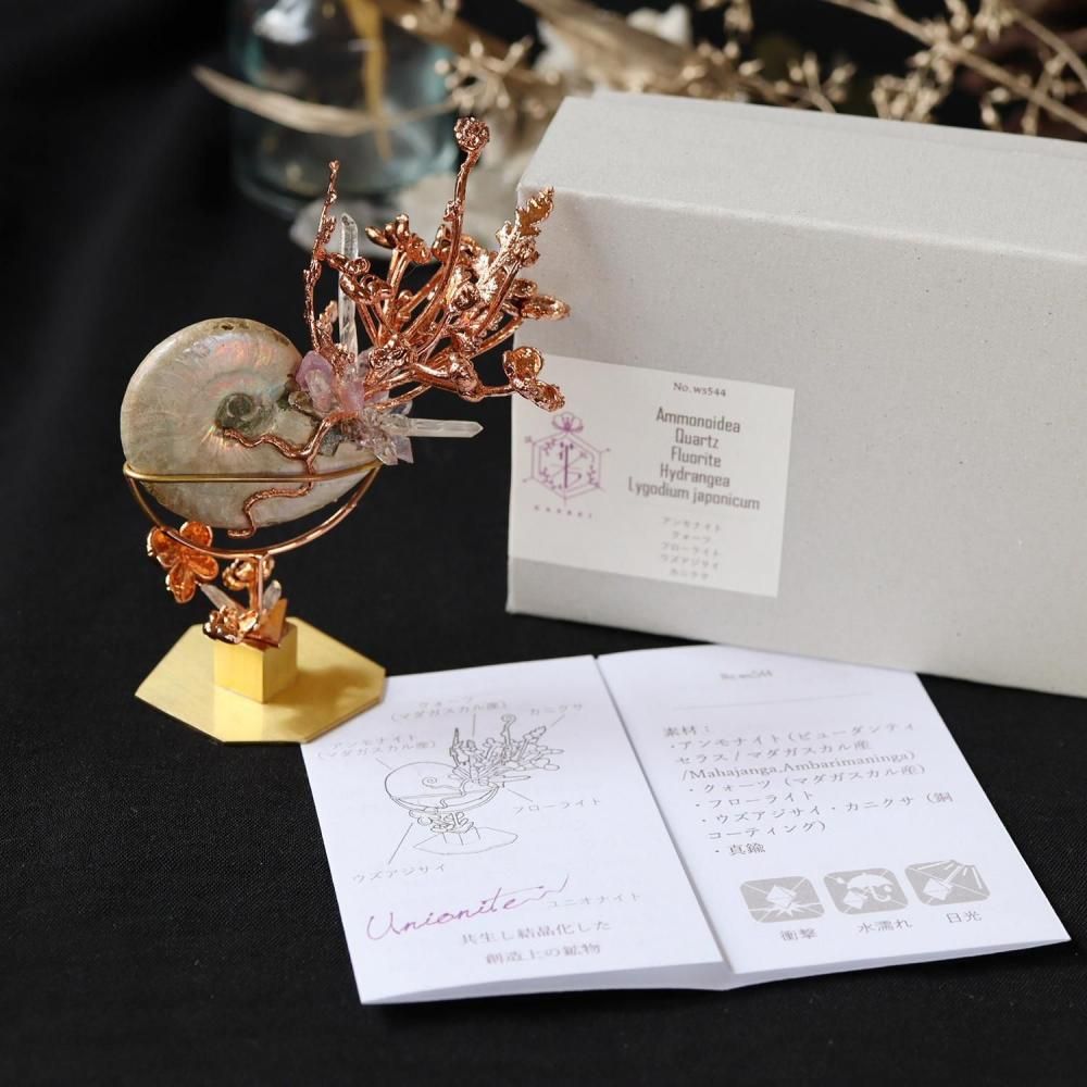 素材:アンモナイト(ビューダンティセラス/マダガスカル産/Mahajanga,Ambarimaninga)・クォーツ(マダガスカル産)・フローライト・ウズアジサイ/カニクサ(銅メッキ)・真鍮