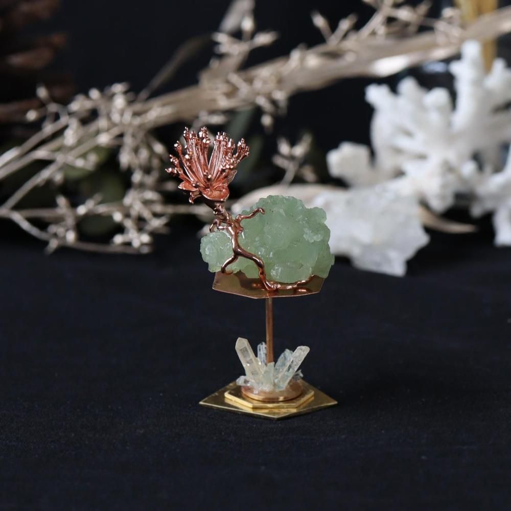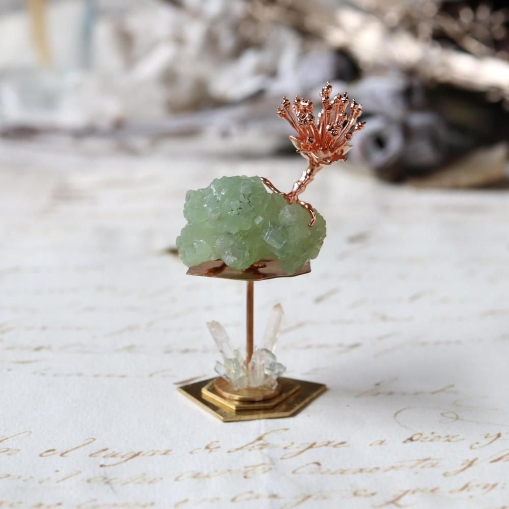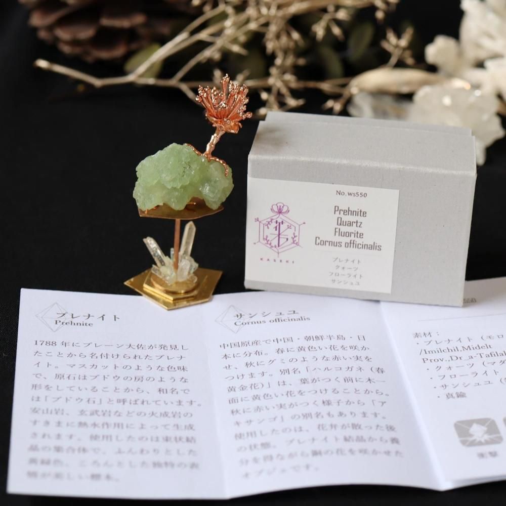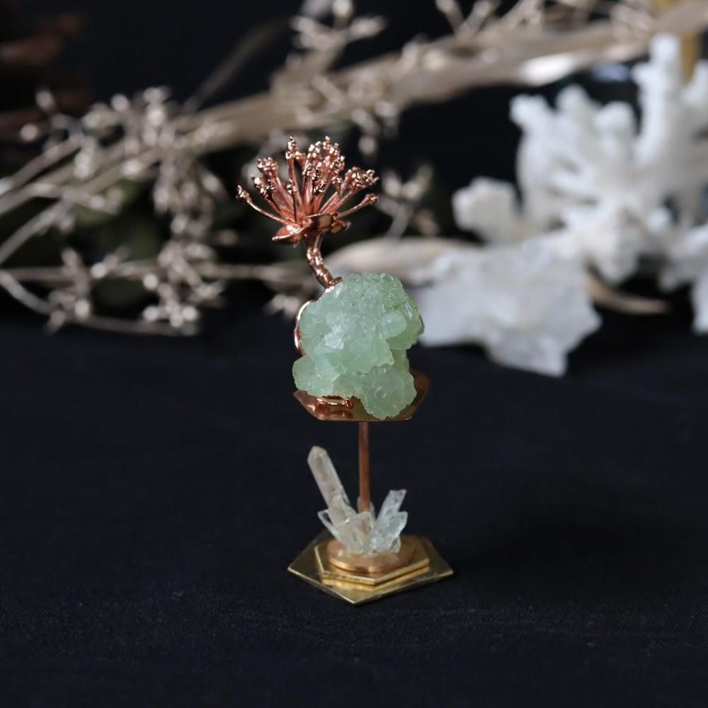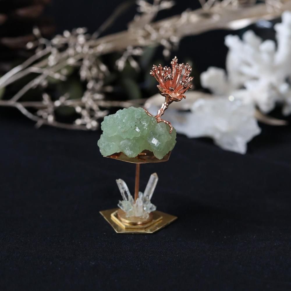 素材:プレナイト(モロッコ産/Imilchil,Midelt Prov.,Dr_a-Tafilalet Region)・クォーツ(マダガスカル産)・フローライト・サンシュユ(銅コーティング)・真鍮