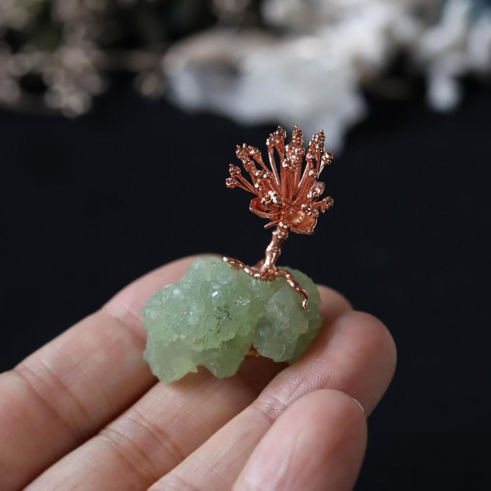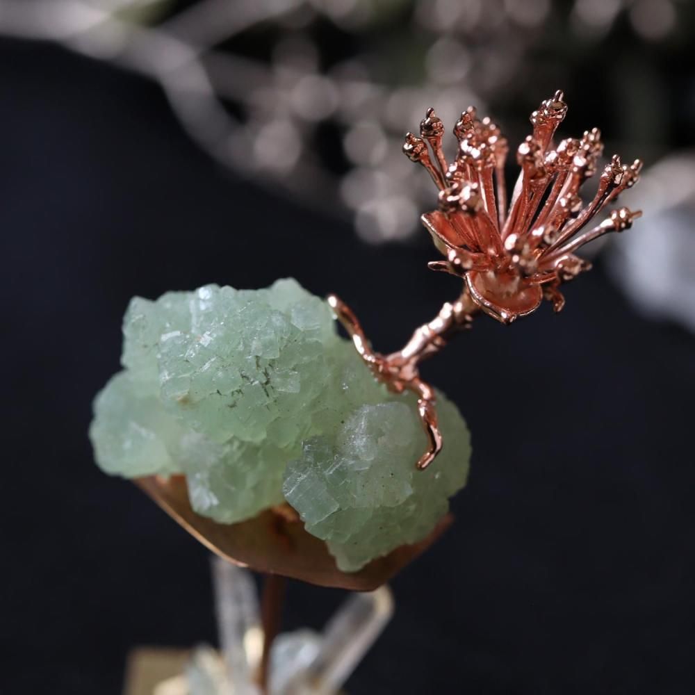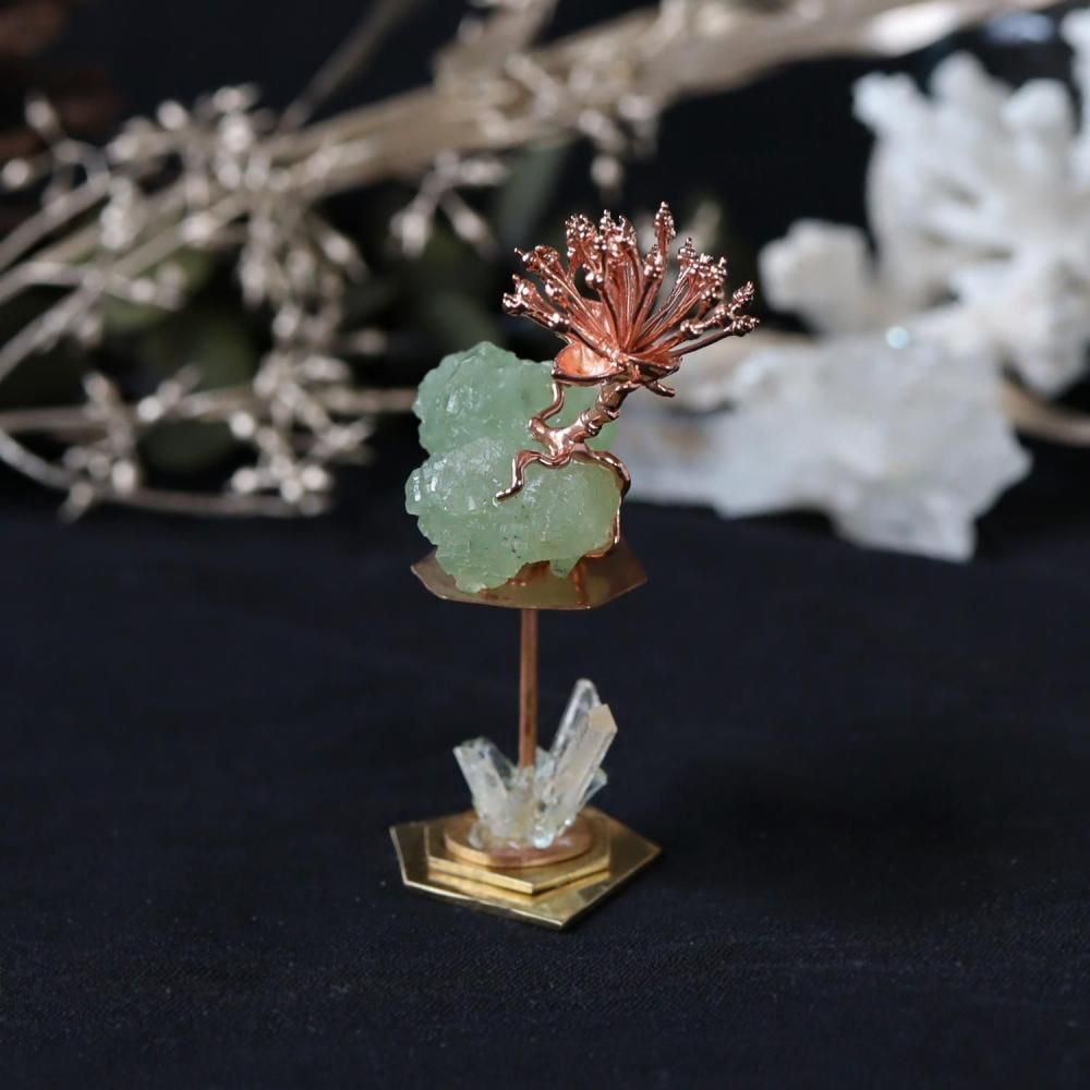 中国原産で中国・朝鮮半島・日本に分布。春に黄色い花を咲かせ、秋にグミのような赤い実をつけます。別名「ハルコガネ(春黄金花)」は、葉がつく前に木一面に黄色い花をつけることから。秋に赤い実がつく様子から「アキサンゴ」の別名もあります。使用したのは、花弁が散った後の状態。プレナイト結晶から養分を得ながら銅の花を咲かせたオブジェです。
