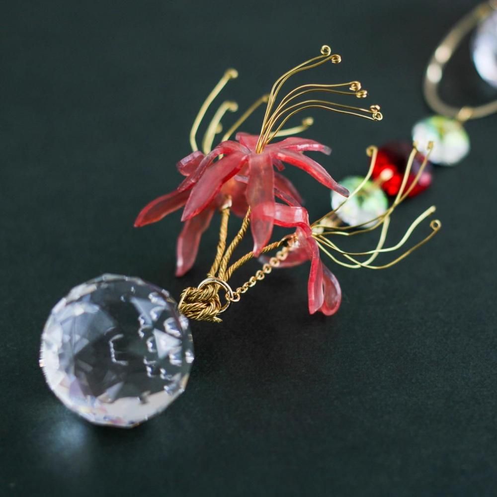 日本の秋を象徴する神秘的な花「彼岸花」をモチーフに、プラ板とワイヤーで一点ずつ丁寧に制作したサンキャッチャーです。