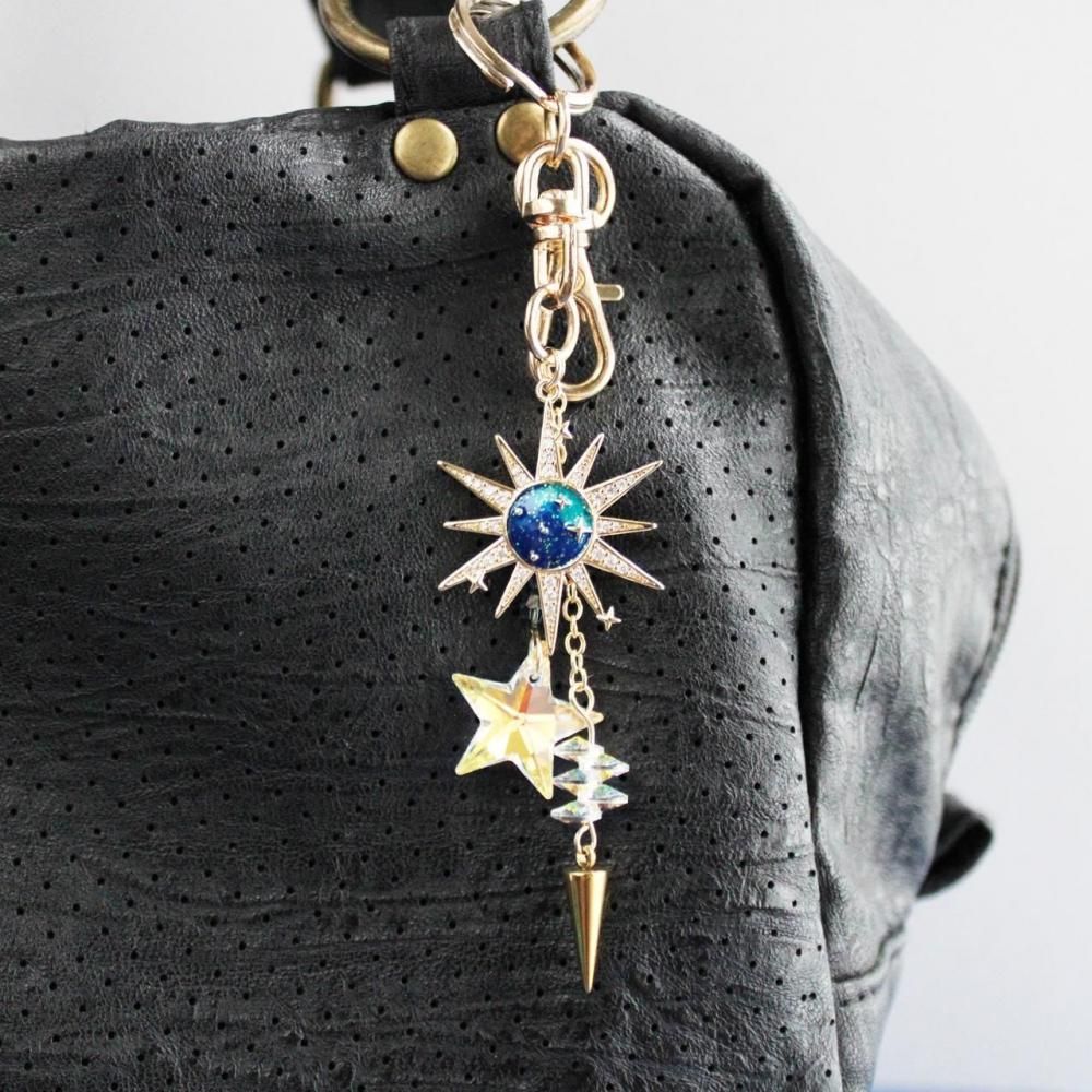 太陽の力強い輝きと、星々の神秘的な煌めきを重ね合わせた、幻想的なバッグチャーム型サンキャッチャーです。