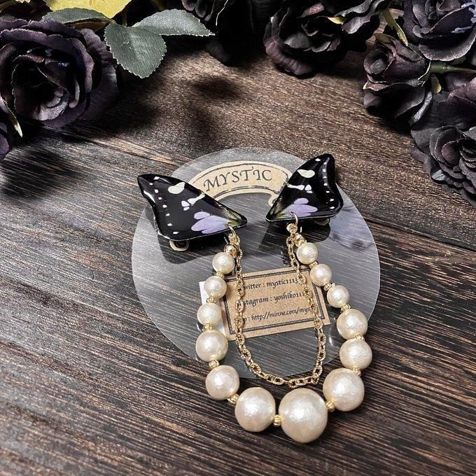 左右の羽をコットンパールチェーンで繋いだブローチです。