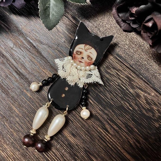 黒ねこの着ぐるみを着たドールモチーフのブローチです。